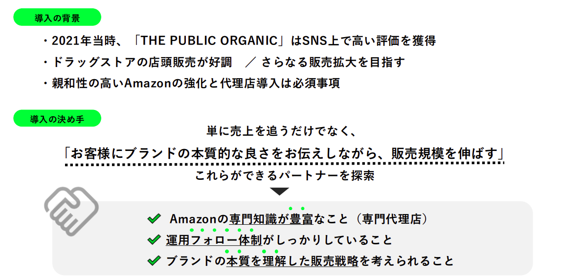 代理店様についてのお話をさせていただきますと、2020年から2021年当時に遡ります。その頃すでに「THE PUBLIC ORGANIC」はSNSで非常に高い評価をいただいており、ドラッグストアなどの店頭販売も非常に好調でした。