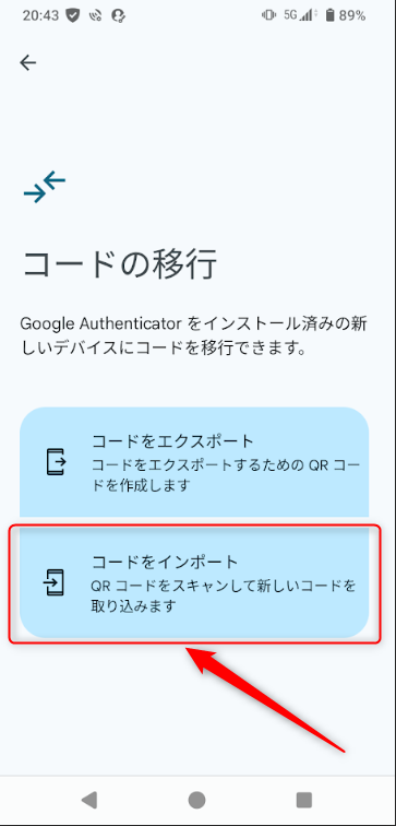 4.画面左上の横三本線アイコンより、「コードの移行」をタップ後に、「コードをインポート」をタップする。