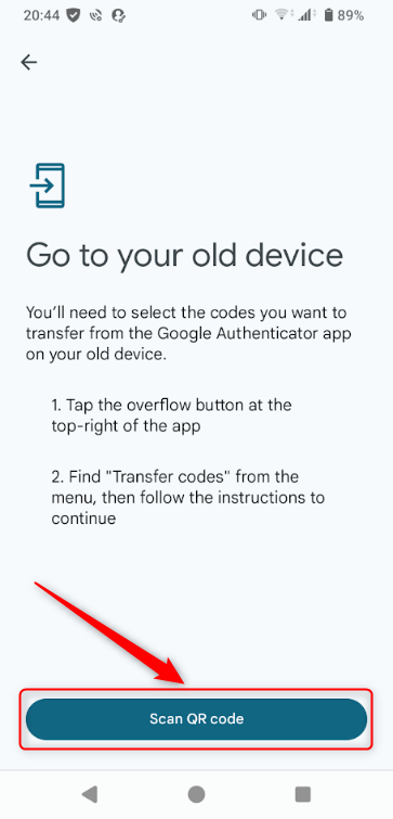 5.Go to your old deviceの画面の下部にある「Scan QR code」をタップする。