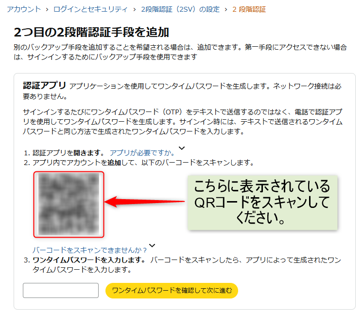 9.【スマートフォンで対応】2つ目の2段階認証手段を追加画面に表示されているQRコードを手順5の画面下部にある「Scan QR code」でタップした後にスキャンをすれば完了です。