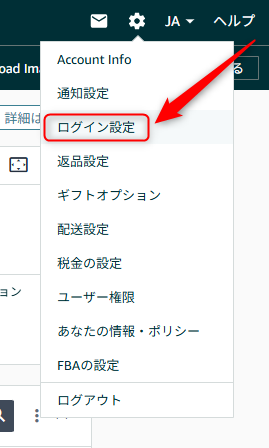 • セラーセントラルトップ画面の右上の歯車アイコンより、「ログイン設定」をクリックする。