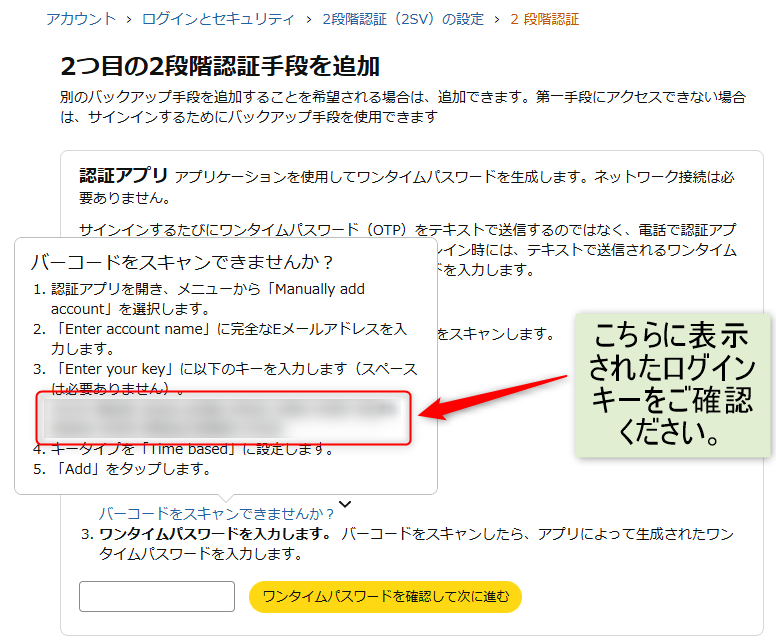 • 2つ目の2段階認証手段を追加画面の「バーコードをスキャンできませんか?」をクリックし、表示されたログインキーを確認する。
