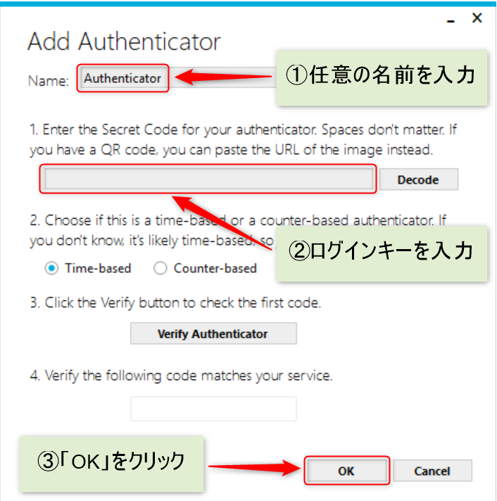 4.Add Authenticator内の「Name」に任意の名称を入力後、1.の項目に上記で確認したログインキーを入力し、「OK」をクリックする。