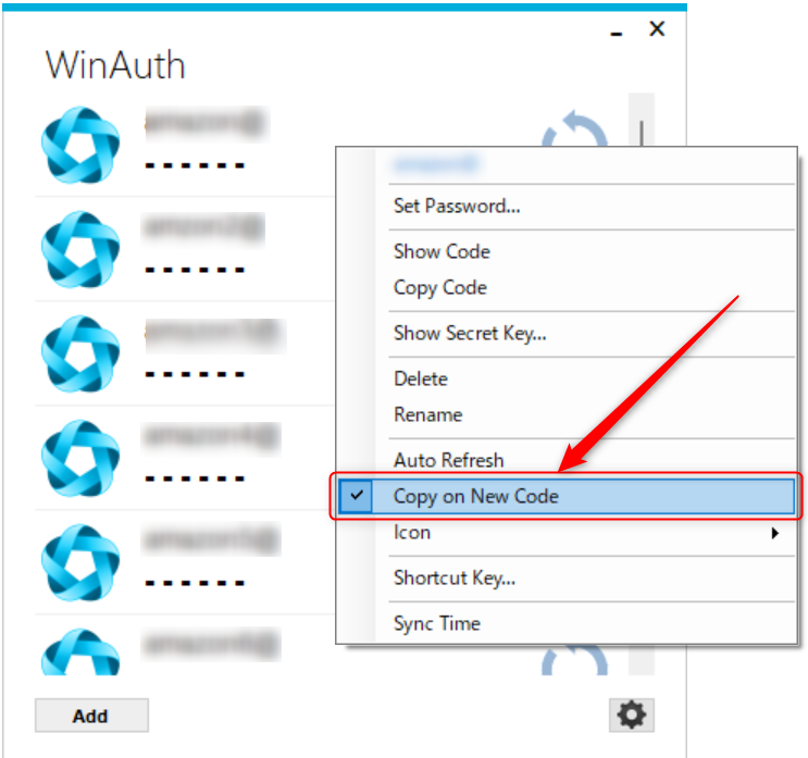 5.WinAuth画面で右クリックを行い、「Copy on New Code」をクリックして完了。