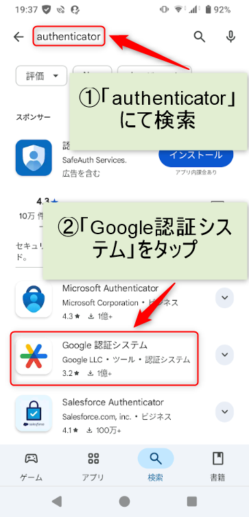 1.iPhone(App Store)もしくは、Android(Google Play)にて「authenticator」で検索し、「Google認証システム」をタップする。