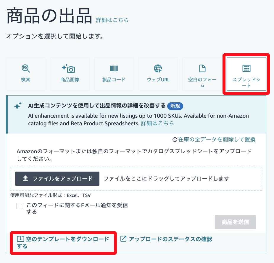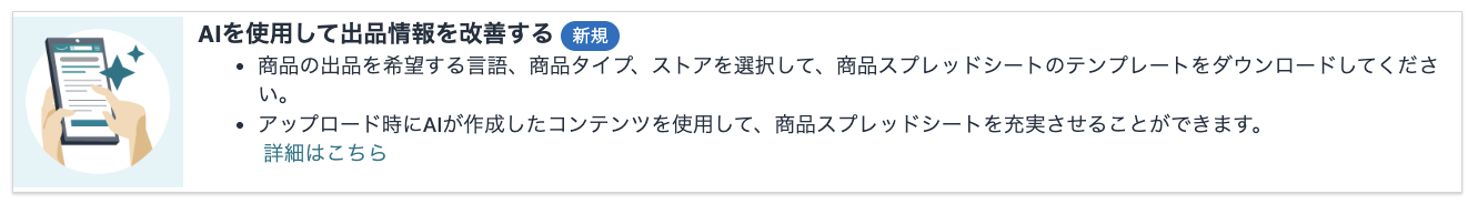 実際にAIを使用して出品情報を改善するには、新しいベータ版の「商品スプレッドシート」のダウンロードが必要となります。