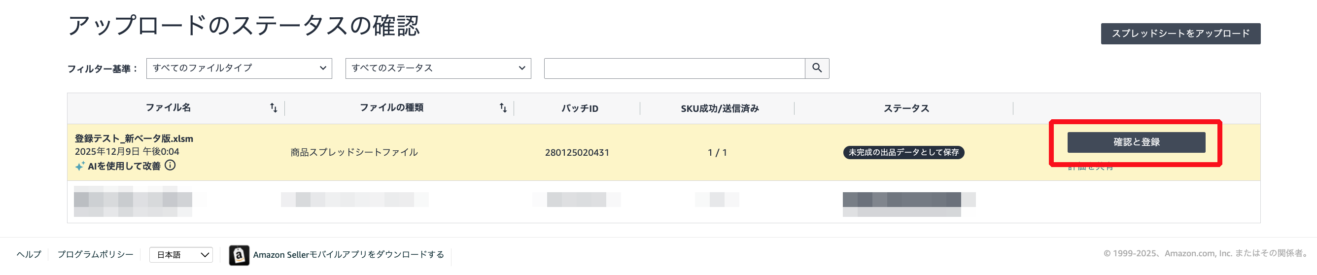 アップロードステータスの確認画面で無事にアップロードが完了していることが確認できたら、「確認と登録」を押下し、登録予定の商品情報の確認をしていきましょう。