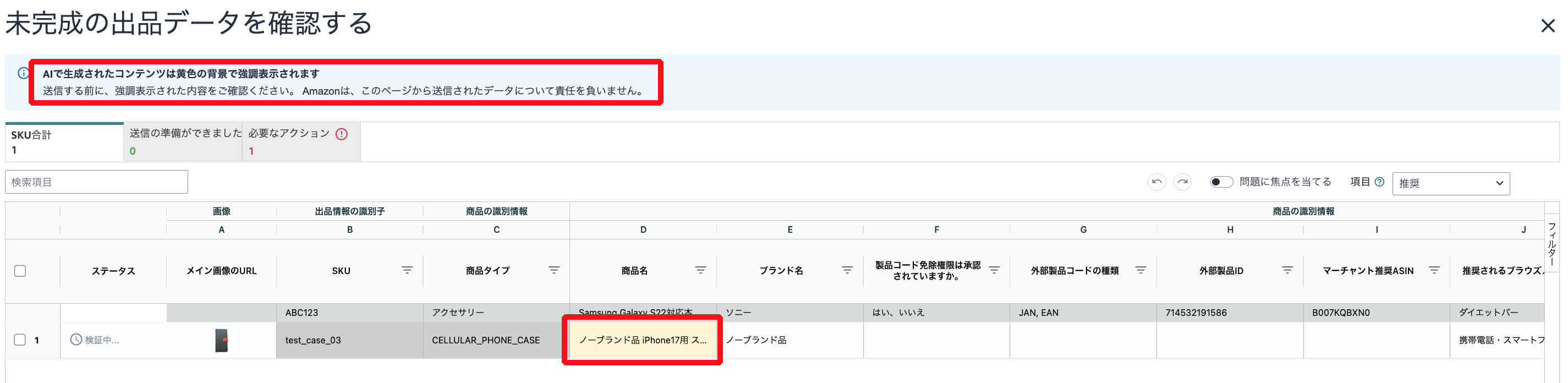 この機能は新規で商品登録しようとしているSKUのみを改善する機能であるため、既にAmazonのカタログに既に登録されているSKUには対応していません。