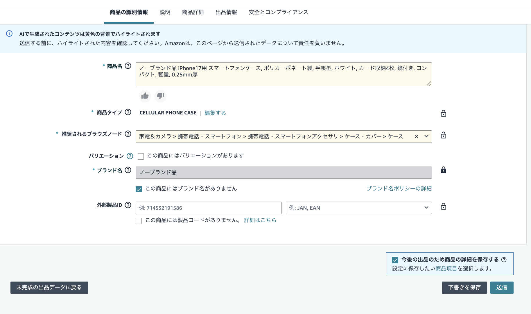 「未完成の出品データを確認する」画面に遷移しますので、ここから事前に入力した内容やAIで入力、改善された商品情報の確認を行うことが可能です。