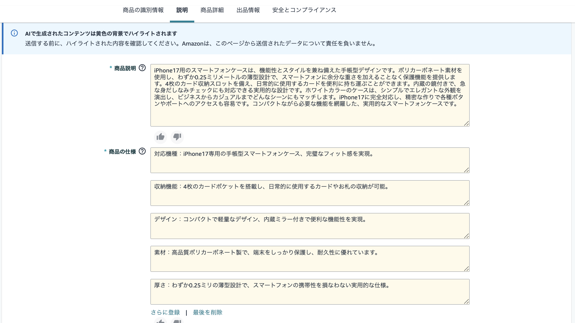 (後述では、「AI を使用して出品情報を改善する」を活用すると、どのような出品情報が生成できるのか、検証結果として解説しています。)