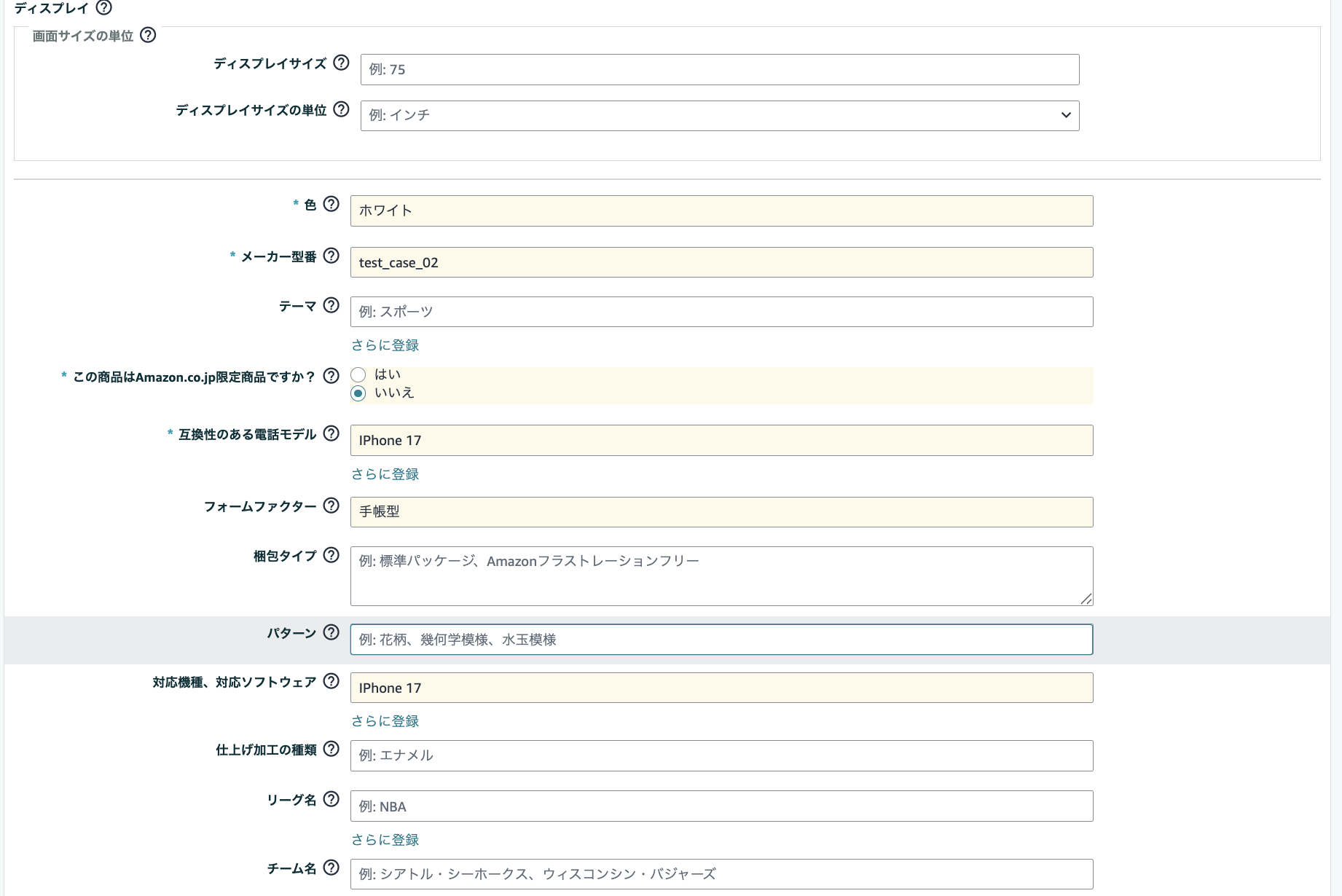 特に事前に入力されていた商品名から類推して商品説明文や商品の仕様、その他特徴に情報が入力されていたり、Amazonが入力を推奨している商品名の前にブランド名を記載するなど、登録時に至らない部分のケアもしっかり行われております。