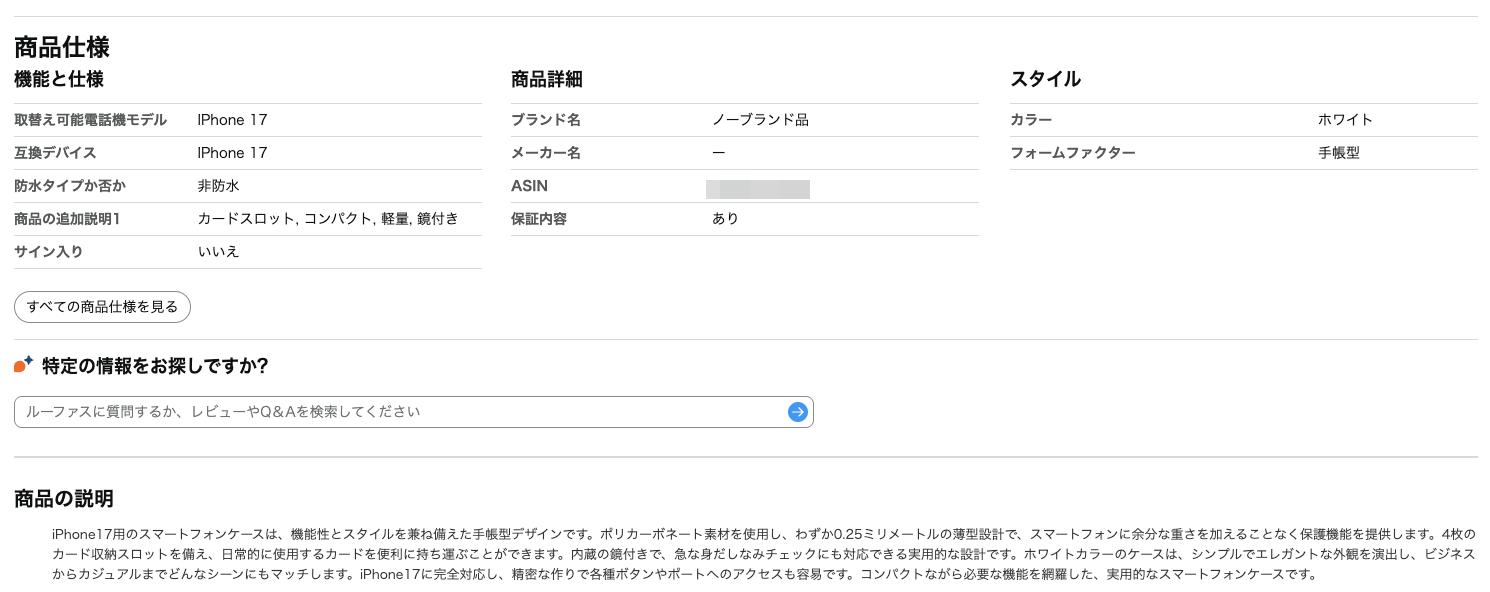実際にAI生成された出品情報を商品詳細ページで確認すると下記画像のとおりとなります。