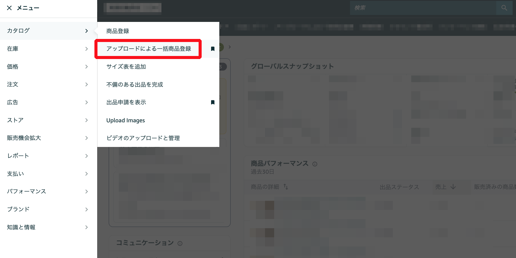 1)左上メニュー>カタログ>アップロードによる一括商品登録を押下。