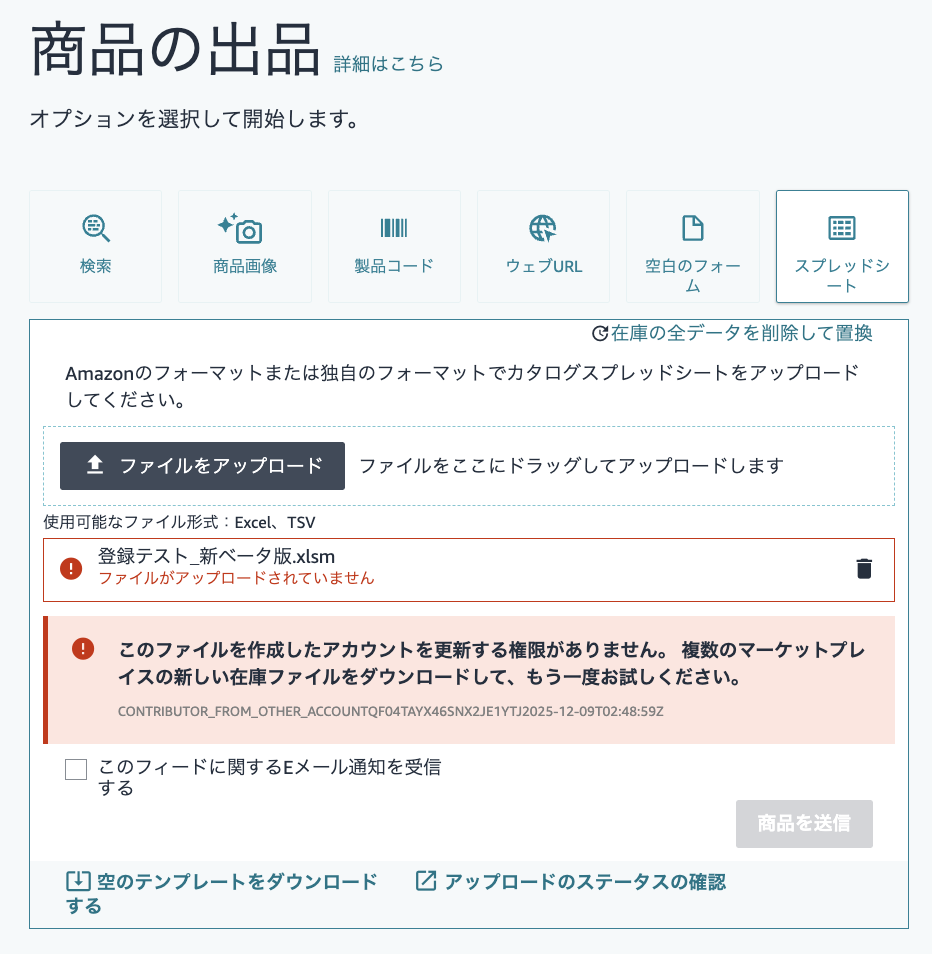 他のアカウントでダウンロードした商品スプレッドシートを、ダウンロードして目的のアカウントでアップロードをすると、エラーが発生してアップロードに失敗します。