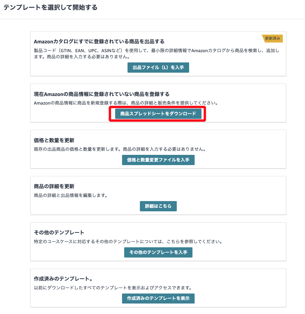 3)上から2番目「現在Amazonの商品情報に登録されていない商品を登録する」にある「商品スプレッドシートをダウンロード」を押下。