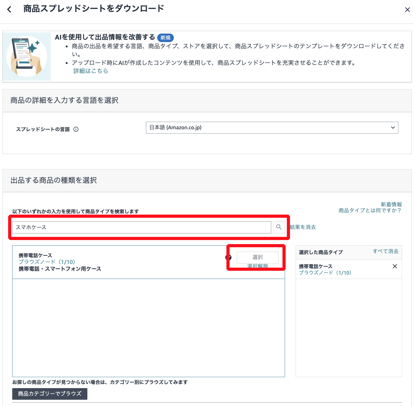 今回は「スマホケース」と入力し、携帯電話ケースの商品タイプを選択していきます。