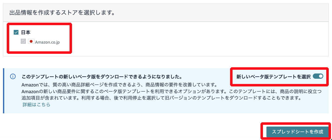 5)出品情報を作成するストアを選択し「新しいベータ版テンプレートを選択」のトグルをオンにして「スプレッドシートを作成」を押下。