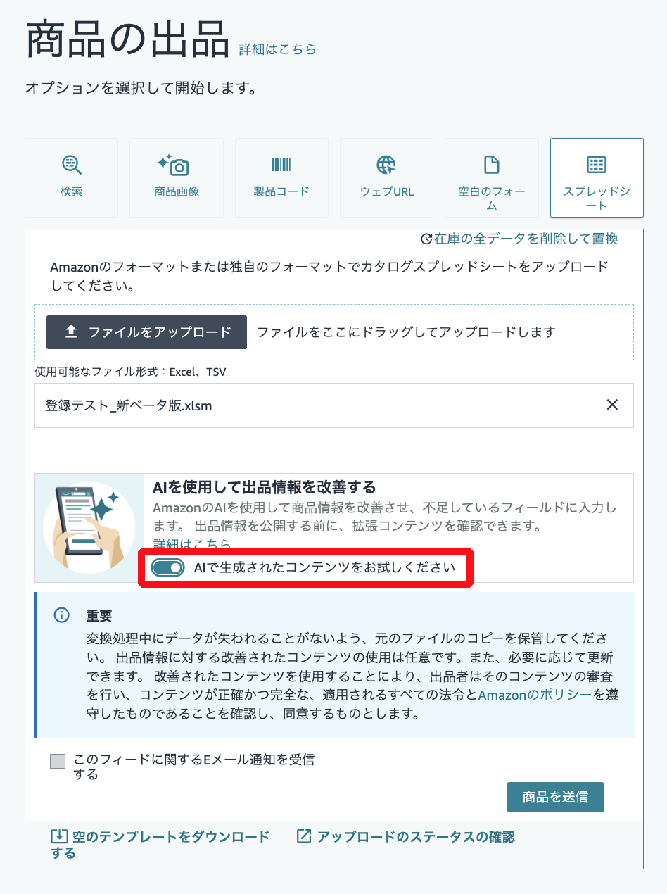 ファイルが正常に取り込まれると、「AI を使用して出品情報を改善する」という項目が表示されます。