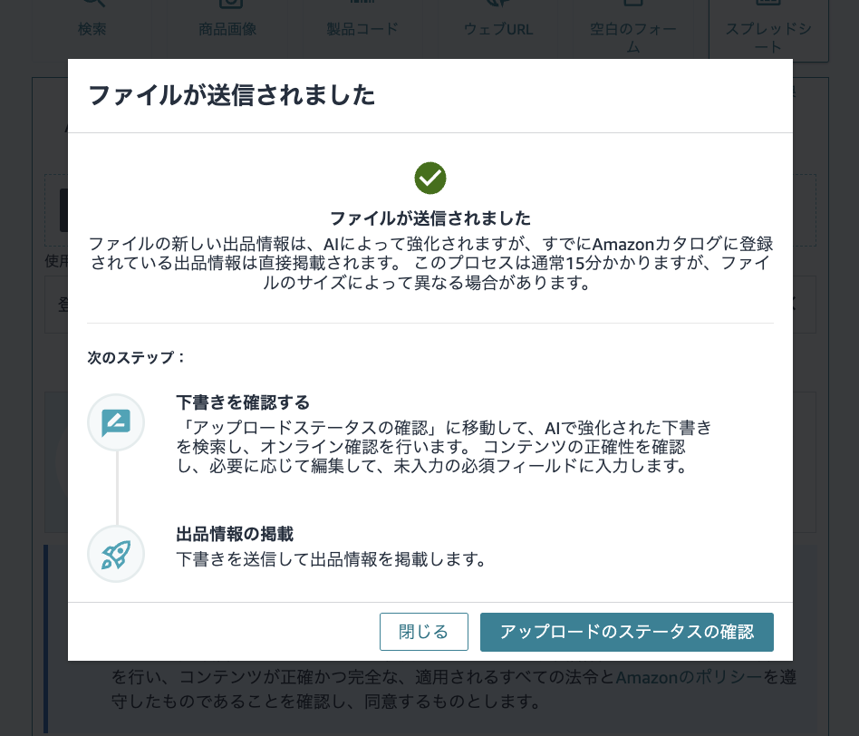 送信すると、上記のような処理完了のポップアップが表示されますので、引き続きアップロードステータスを確認してください。