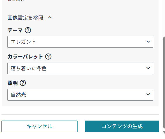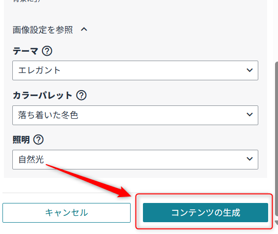 生成した内容に違和感があれば、「再生成」を試し、プロンプトを少しずつ書き換えたり、画像設定の項目(カラーパレットや照明)を変更したりするなど、調整をしながら理想のクオリティに近づけていくことが重要です。