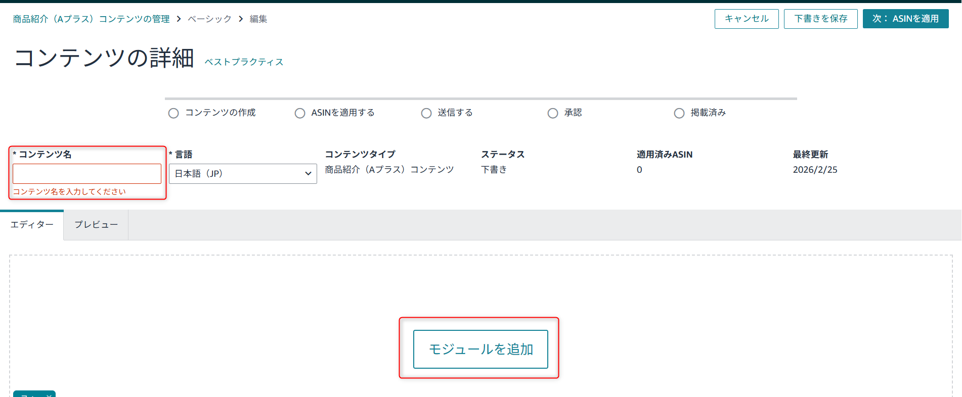 まずは通常の商品紹介コンテンツ(A+/Aプラス)を作成する時と同じ手順で進めます。