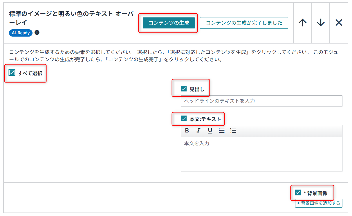 商品紹介コンテンツ(A+/Aプラス)の管理画面において、青色の「AI Readyバッジ」がついているモジュールが対象となります。