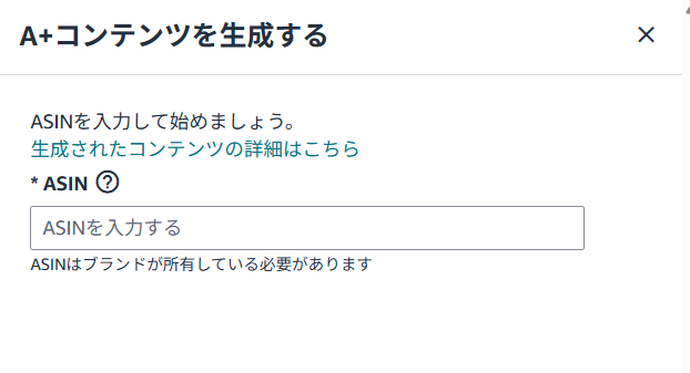 生成する要素が決まったら、「コンテンツの生成」を選択し、詳細な設定ページ(A+コンテンツを生成する)に移動