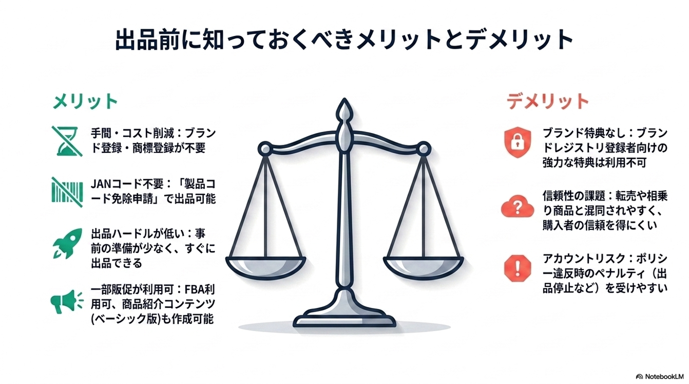 ノーブランド品は、比較的簡単な手順でコストや手間がかかりにくいことがメリットですが、一方でノーブランド品のポリシーを遵守しない場合はアカウント健全性へ影響を与えることやブランド特典が使用できないことがデメリットです。