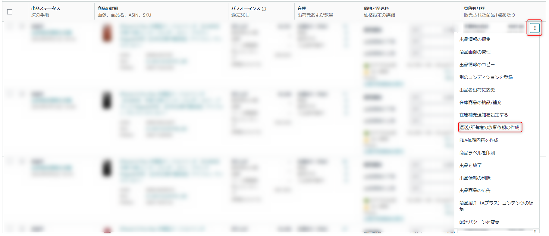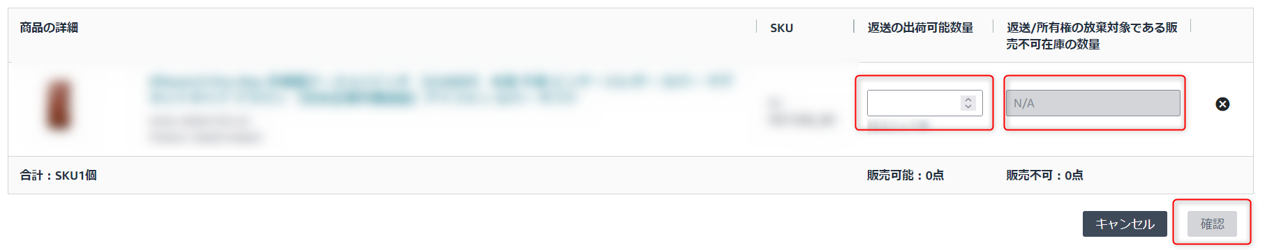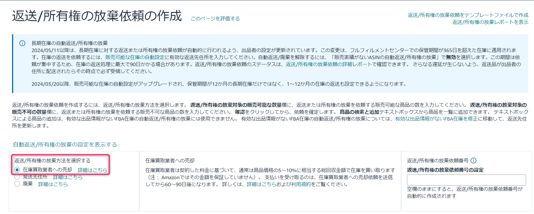 ※このオプションが表示されない場合、返送/所有権の放棄が推奨される在庫はありません。