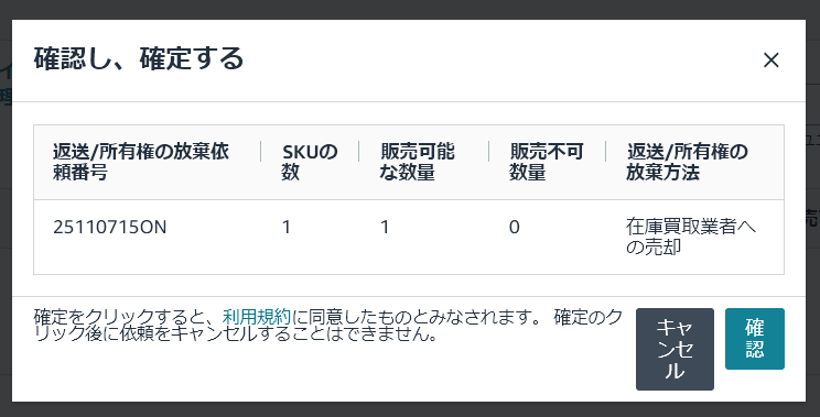 セラーセントラルの「在庫健全化ツール」や「返送/所有権放棄依頼」ページから買取依頼を出すと、Amazonが30日以内に買取業者を探す手配をしてくれます。